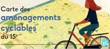 La mairie du 15e arrondissement a mis en ligne une carte des aménagements cyclables du 15e avec les rues en double-sens, les bandes cyclables, les pistes cyclables ou encore les zones marchés (fichier à télécharger sur le site de la Mairie du 15e ci-contre illustration copyright mairie du XVeme arrondissement de Paris).